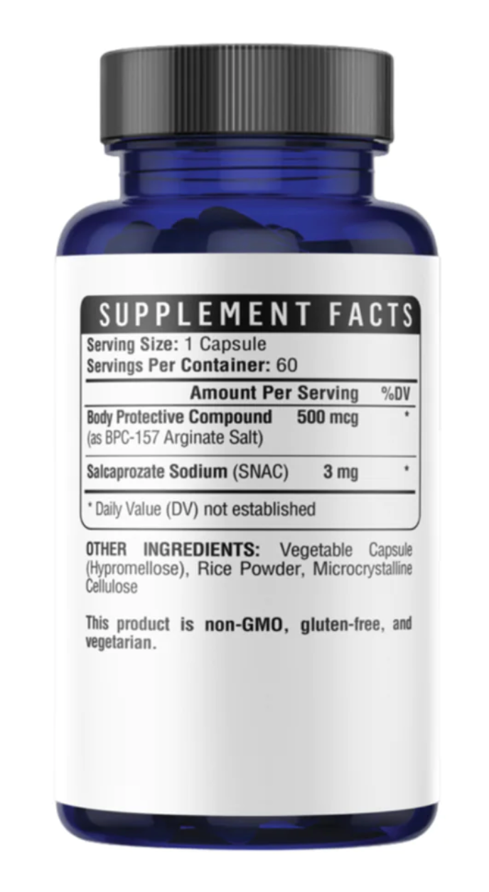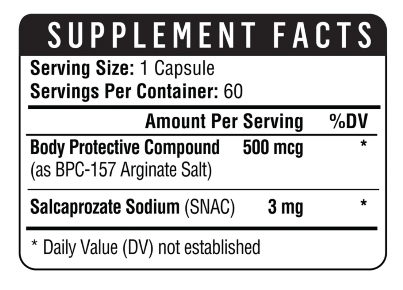 Contains BPC-157 (Body Protection Compound-157), a pentadecapeptide derived from human gastric juice, combined with SNAC (salcaprozate sodium) for enhanced absorption; also known as the "Wolverine peptide" due to its regenerative properties