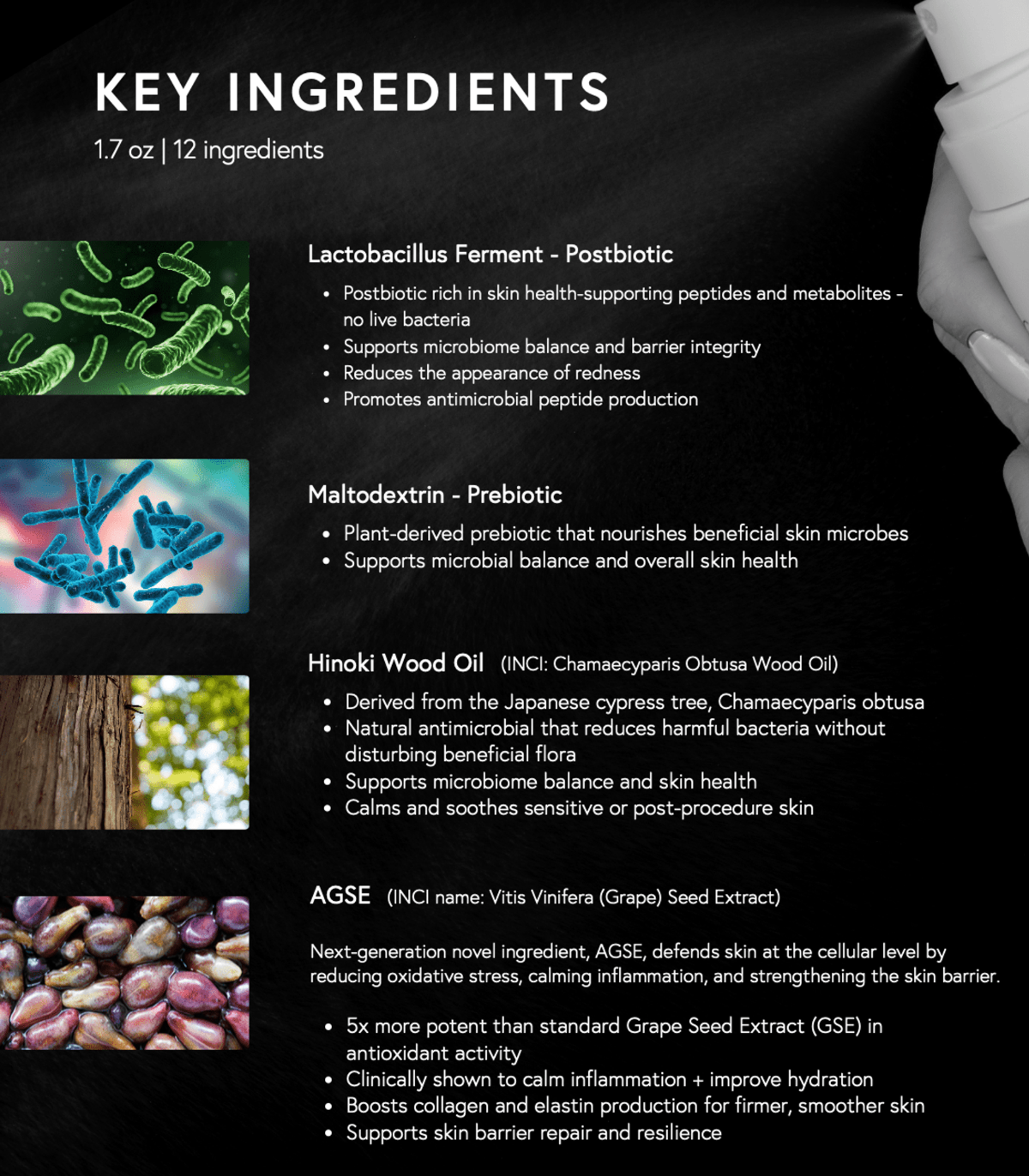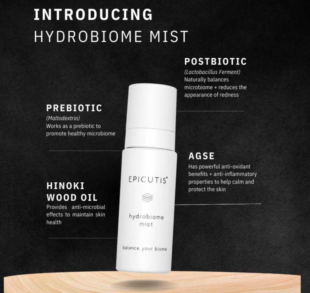 EPICUTIS® Hydrobiome Mist utilizes the naturally occurring postbiotic, Lactobacillus and Maltodextrin as a prebiotic to promote healthier skin without preservatives and other unnecessary, skin damaging ingredients. Highlighted by technology developed at Princeton University, proprietary ingredient Activated Grape Seed Extract (AGSE) formulated with Hinoki Wood Oil, boosts skin hydration and barrier function, while providing anti-microbial andantioxidant properties to protect the skin.