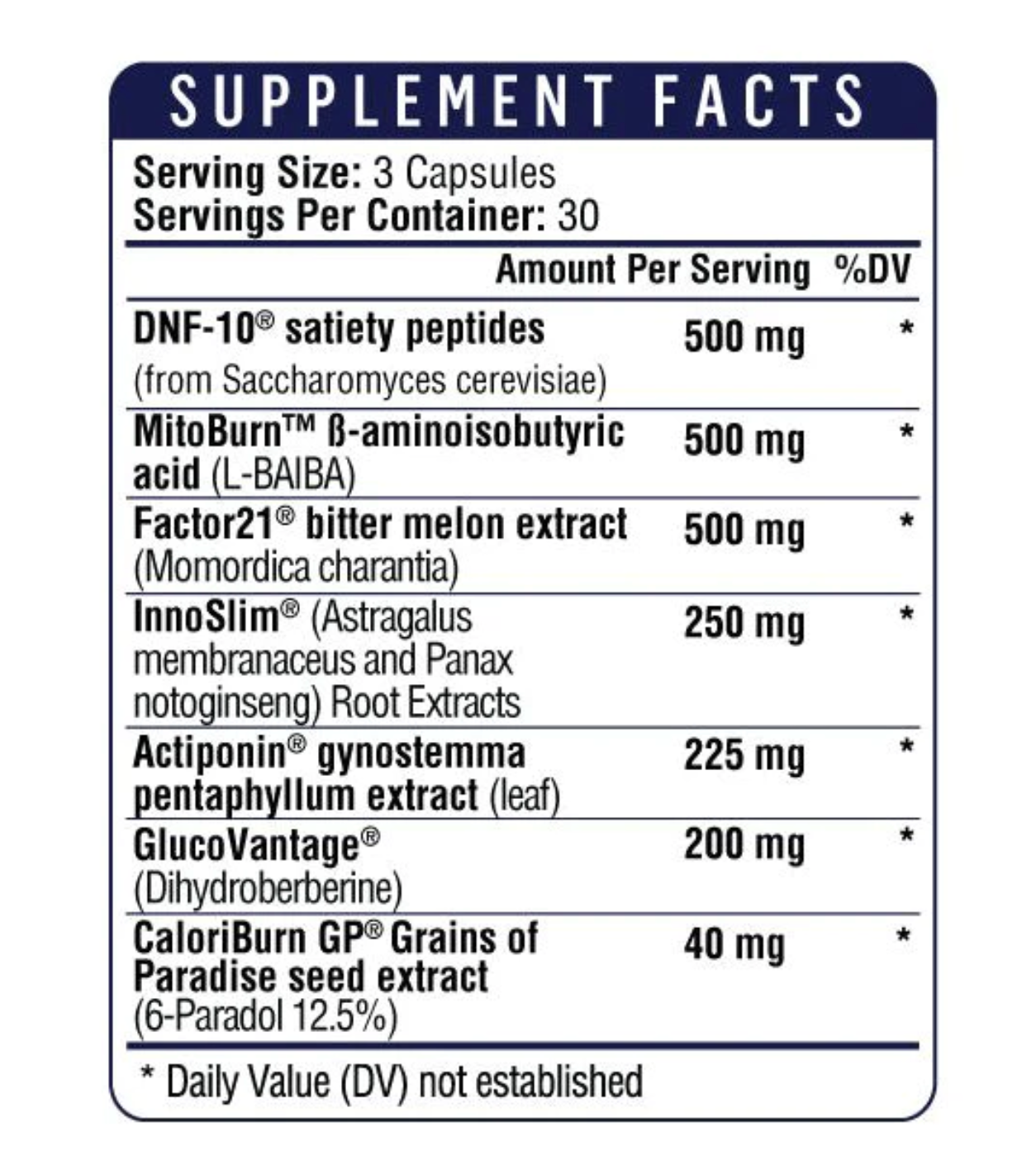 Contains InnoSlim® (a blend of Panax notoginseng and Astragalus root extracts), Actiponin® (gynostemma pentaphyllum extract), and other ingredients designed to reduce glucose absorption and improve metabolic efficiency